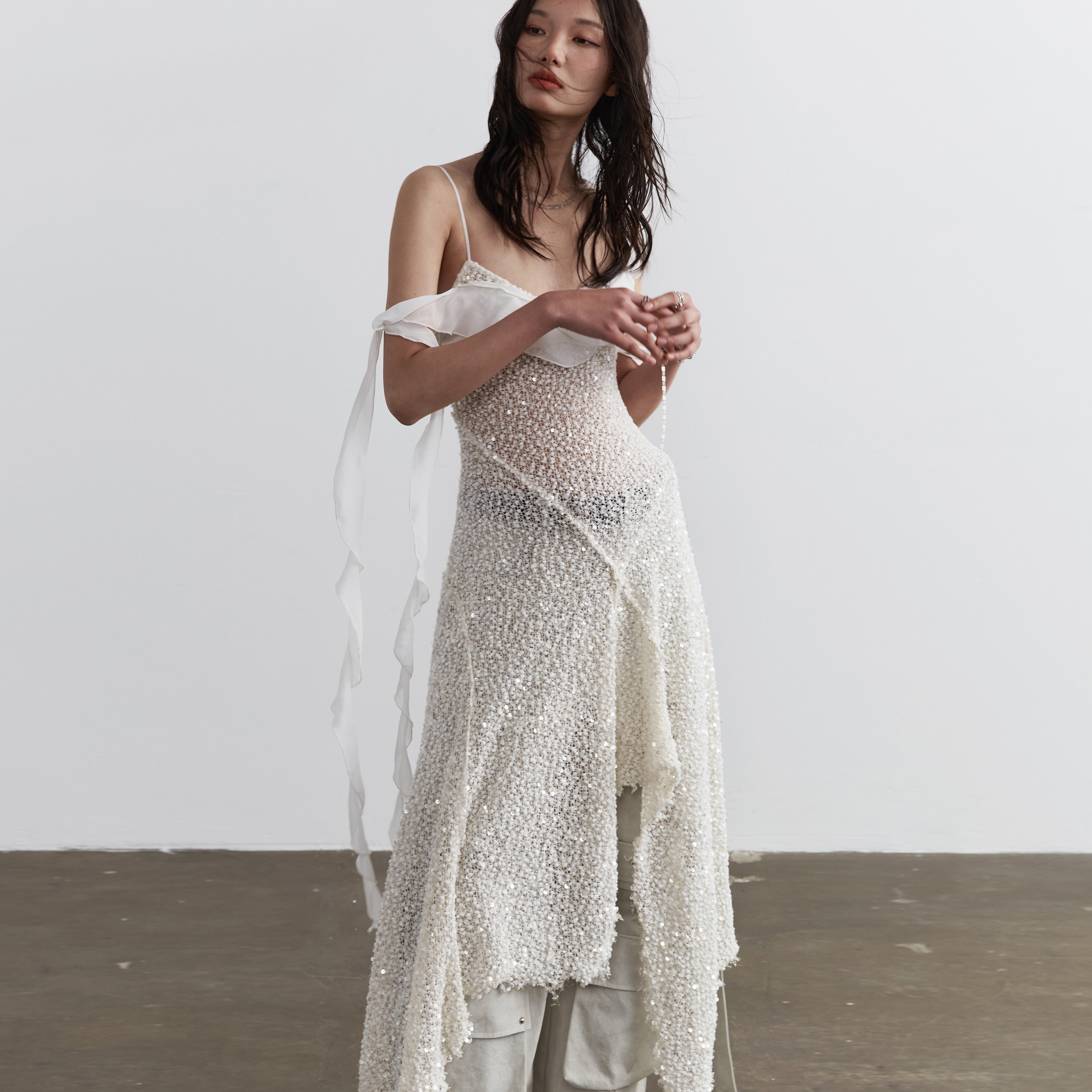 JNYLON 샤이닝 갤럭시 서스펜더 스커트로 스타들을 향해 패션 감각을 펼쳐보세요. 독특한 니트 스팽글 디자인과 불규칙한 밑단이 특징인 이 스커트는 옷장에 광채와 파괴적인 분위기를 더합니다. 그 스타일은 상상을 초월합니다.